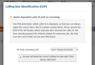 - Select " Device-dependent caller-id (CLIP no screening)" and open the menu with the default settings for telephone systems.