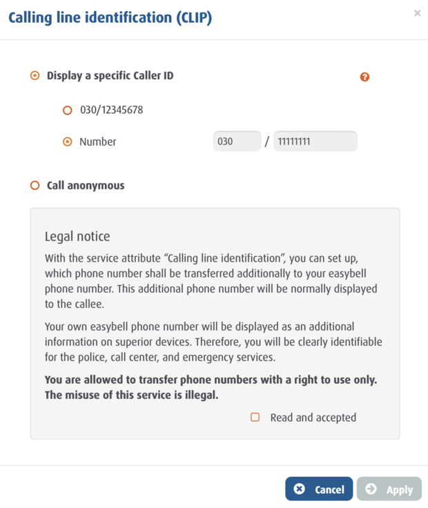 Attention!For regulatory reasons, it is only possible to signal German local and mobile phone numbers as well as free German special phone numbers with the Device-dependent caller-id. You can find more information about this in our article "Which phone numbers can I display starting from?“.